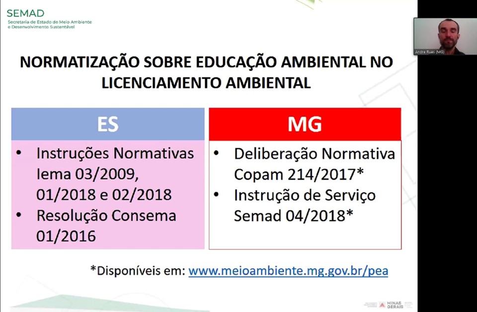 As palestras foram conduzidas por André Ruas e Priscila Martins Ferreira, servidores da Secretaria de Estado de Meio Ambiente e Desenvolvimento Sustentável (Semad) de Minas Gerais. Eles falaram sobre a Educação Ambiental no licenciamento e também sobre a experiência mineira, fazendo ainda um comparativo com o que é feito e as normativas no Espírito Santo.