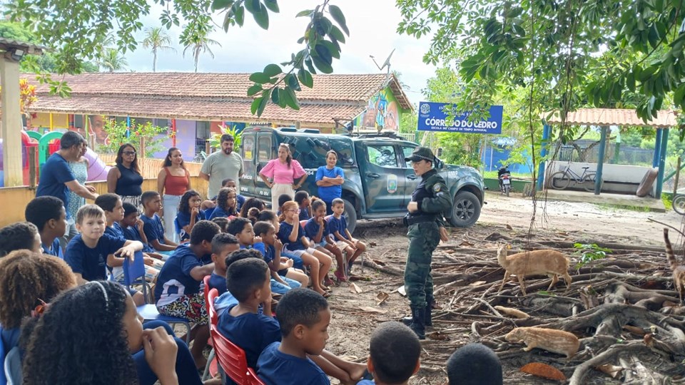 Na ocasião, a Polícia Ambiental tratou especificamente do combate à caça ilegal e de outros temas relacionados à proteção da vida silvestre, orientando os estudantes sobre as implicações dessas práticas para a floresta e para a comunidade do assentamento.