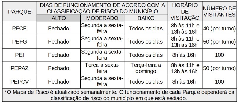 Uma ressalva é que todas as UCs ficarão com o Centro de Visitantes fechados para evitar aglomerações e os visitantes deverão usar máscaras, levar o próprio recipiente para beber água, além do álcool gel 70% para realizar a higienização das mãos com frequência. Pessoas que fazem parte do Grupo de Risco para a Covid-19 devem evitar a visitação às UCs ou acessar em horários de menor lotação, de acordo com a portaria do Governo do Estado (confira no final da matéria).