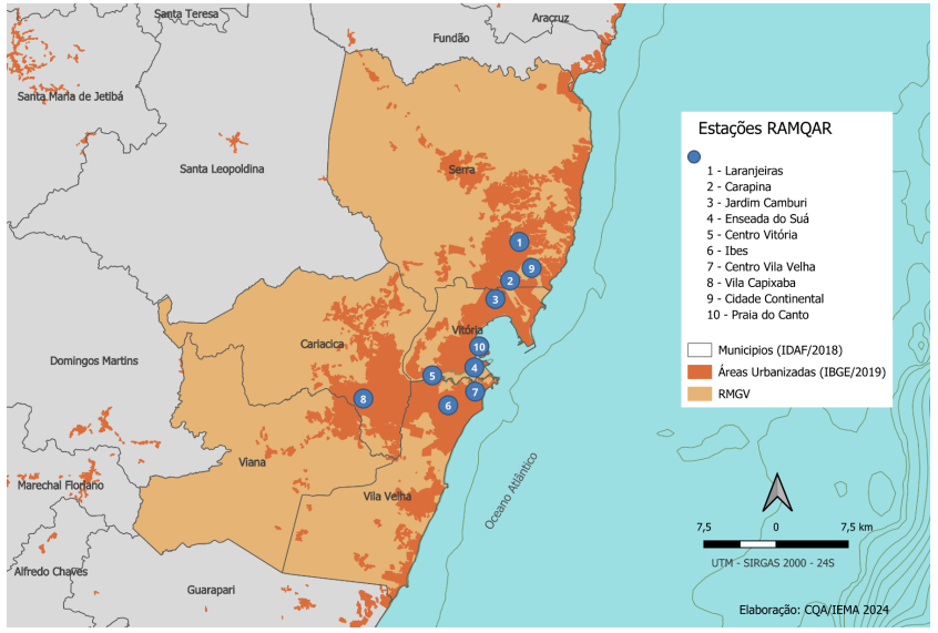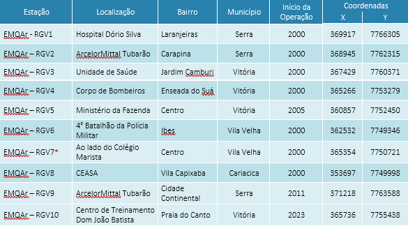 A RAMQAr – RGV iniciou suas operações em 2000, sendo viabilizada por meio de condicionantes das Licenças de Instalação da Vale (LI nº 055/96) e da ArcelorMittal Tubarão (LI nº 063/96). Atualmente, a RAMQAR da RGV é composta por 10 estações de monitoramento localizadas nos municípios de Cariacica, Vila Velha, Vitória e Serra. As estações que compõem a RAMQAr da RGV são de propriedade do Estado do Espírito Santo, a operação da RAMQAr é realizada por empresa contratada através de licitação pública, com a supervisão e gerência de servidores do IEMA.
