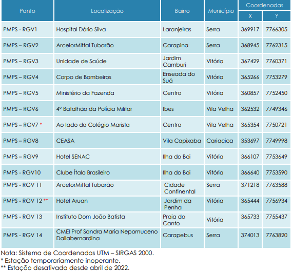 A RMPS foi implantada em abril de 2009 com nove (9) pontos de monitoramento. Em dezembro do mesmo ano, a rede foi ampliada para onze (11) pontos de monitoramento. No ano de 2024, a rede contou com doze (12) pontos ativos. O ponto de monitoramento PMPS – RGV7, localizado ao lado do Colégio Marista, encontra-se temporariamente inoperante, até que o IEMA concretize sua realocação, e o ponto conhecido por PMPS - RGV12, situado no Hotel Aruan, foi desligado permanentemente desde abril de 2022.