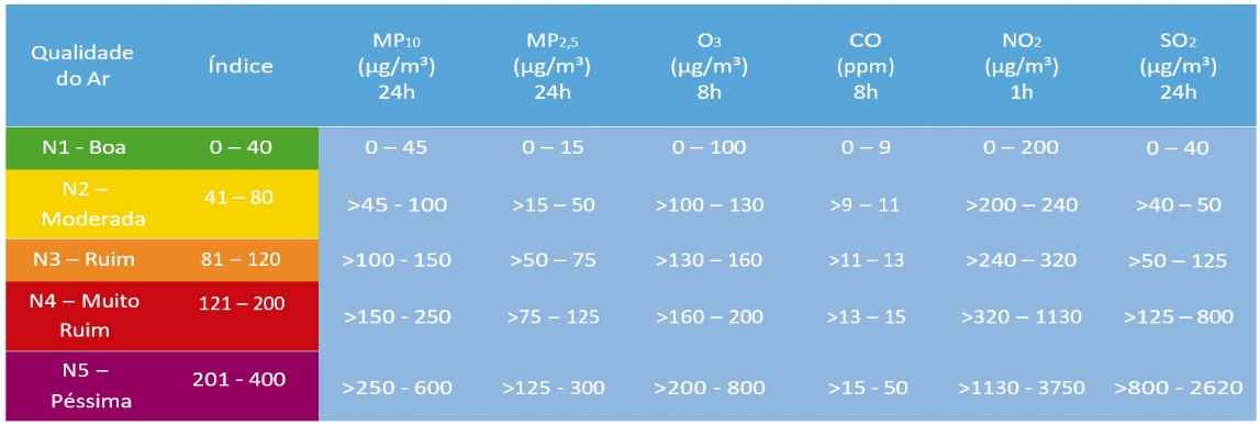 O Índice de Qualidade do Ar - IQAr é representado por um valor numérico adimensional calculado a partir de funções lineares descontínuas em cinco faixas de valores que varia de 0 (zero) a 400 (quatrocentos). Cada uma destas cinco faixas do índice está associada a uma classificação da qualidade do ar. Para a definição dos valores de concentração de poluentes atmosféricos, foram utilizados como referência os valores-guia, estabelecidos pela Organização Mundial da Saúde (2021) e os padrões de qualidade do ar estabelecidos pela Resolução Conama nº 506/2024.